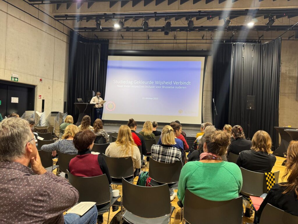 Op 21 oktober vierden we het 5 jarig bestaan van Gekleurde Wijsheid met het event en studiedag Gekleurde Wijsheid verbindt: Naar meer respect en inclusie voor Brusselse ouderen waarin we de verzamelde noden van de Brusselse ouderen en onze laagdrempelige werkwijze met andere professionals konden delen. We presenteerden ook onze nieuwe publicatie, waarin we de ervaringen uit vijf jaar Gekleurde Wijsheid bundelden. In de namiddag kwamen de ouderen er ook bij en aten we samen een heerlijke lunch waarna we de nieuwe filmportretten ‘Ouder worden in Brussel’ bekeken. Het zijn 3 films waarin ouderen hun visie geven op diversiteit, eenzaamheid en dementie. Na de films gingen we samen in dialoog over deze thema’s.